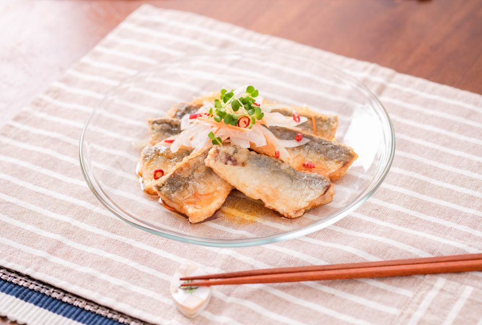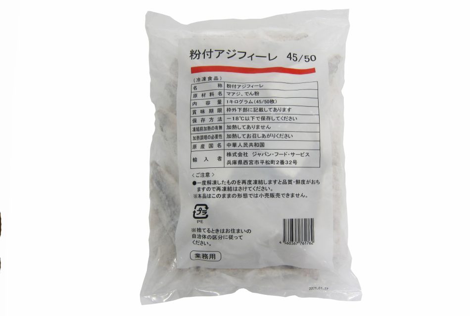 フィーレ加工したマアジに粉付けした商品です。油で揚げて南蛮漬けなどのメニューにご使用頂けます。