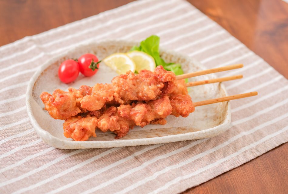 若鶏の唐揚げをジャンボサイズの唐揚げ串に仕上げました。